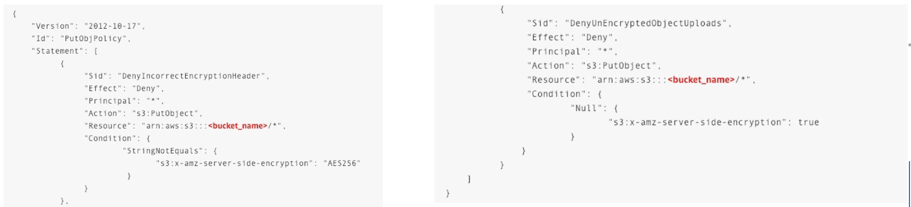 - “강제 암호화”하는 한 가지 방법은 “버킷 정책을 사용하고 암호화를 거부하는 것”이다.