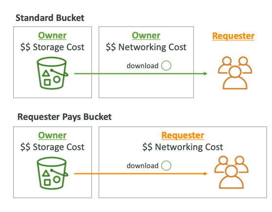 - “요청자 지불”버킷을 사용하면 버킷 소유자 대신 요청자가 요청 비용과 버킷에서 데이터 다운로드 비용을 지불한다.
