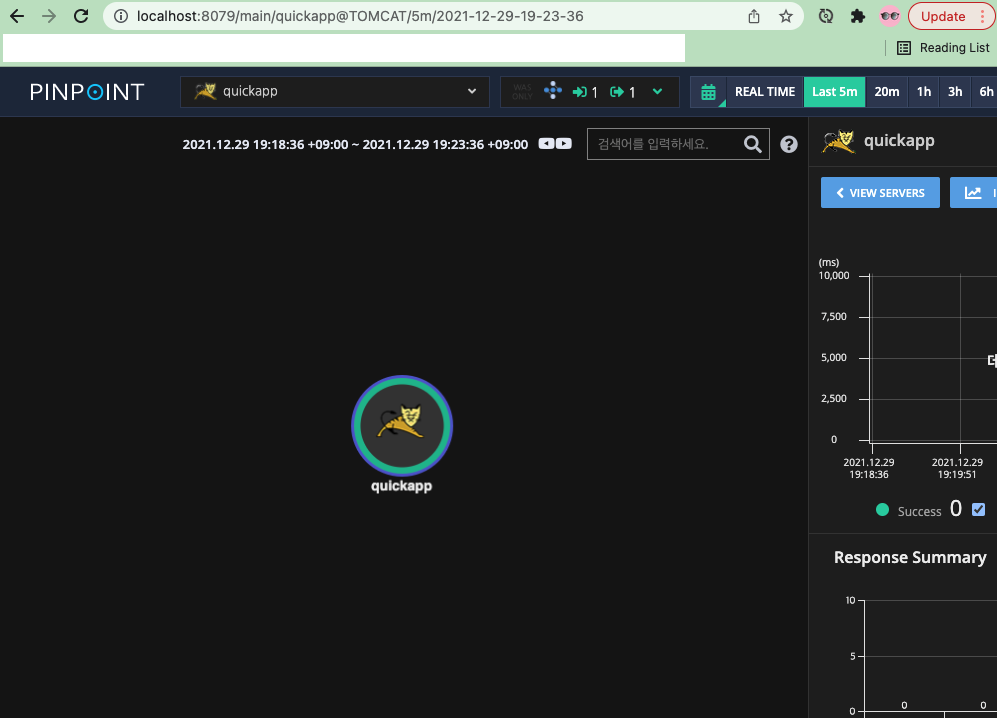 localhost:8079 (pinpoint web)으로 접속해보면 [Pinpoint] 로컬 서버 구축과는 다르게 서비스를 선택하는 부분에 quickapp이 생성되었을 것이다. 아래의 이미지와 같은 화면이 나온다면 정상적으로 연동이 완료된 것이다. 이제 pinpoint web (localhost:8079)에서 pinpoint-quickapp의 데이터를 확인할 수 있다.