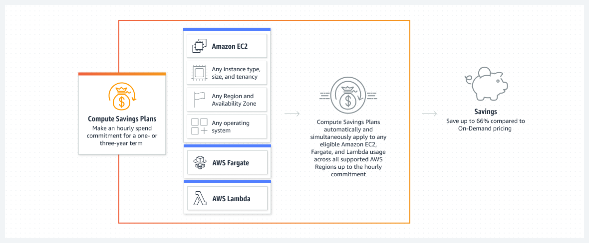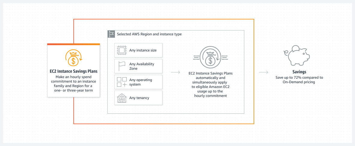 - 안정적인 사용에 대한 비용 절감: 인스턴스 제품군, 리전, 운영 체제 및 데넌시와 관계없이 전반적인 안정적인 사용에 대한 컴퓨팅 요금을 줄인다.