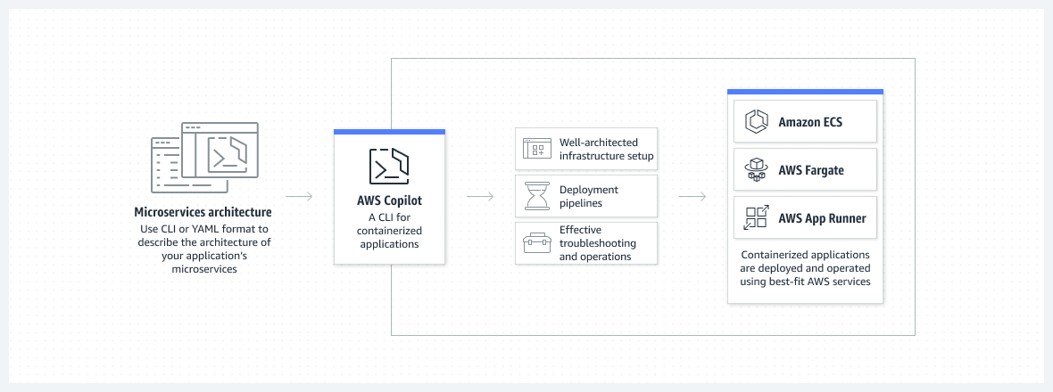 - AWS Copilot은 AWS에서 컨테이너화된 애플리케이션을 빠르게 시작하고 관리하는 데 사용할 수 있는 명령줄 인터페이스(CLI)다.