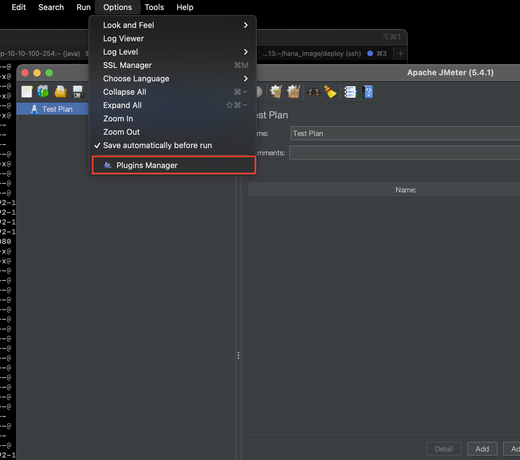 경로에 정상적으로 파일을 이동시켰다면 Jmeter를 재실행시켜보면 아래의 이미지와 같이 Options -> Plugins Manager 버튼이 활성화 되었을 것이다.