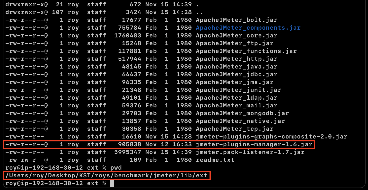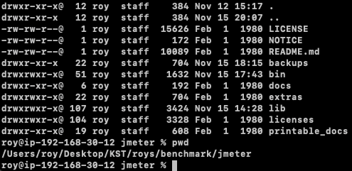 필자의 경우 아래의 이미지에 나와있는 것처럼/Users/roy/Desktop/KST/roys/benchmark/jmeter경로에 압축을 풀어두었다.