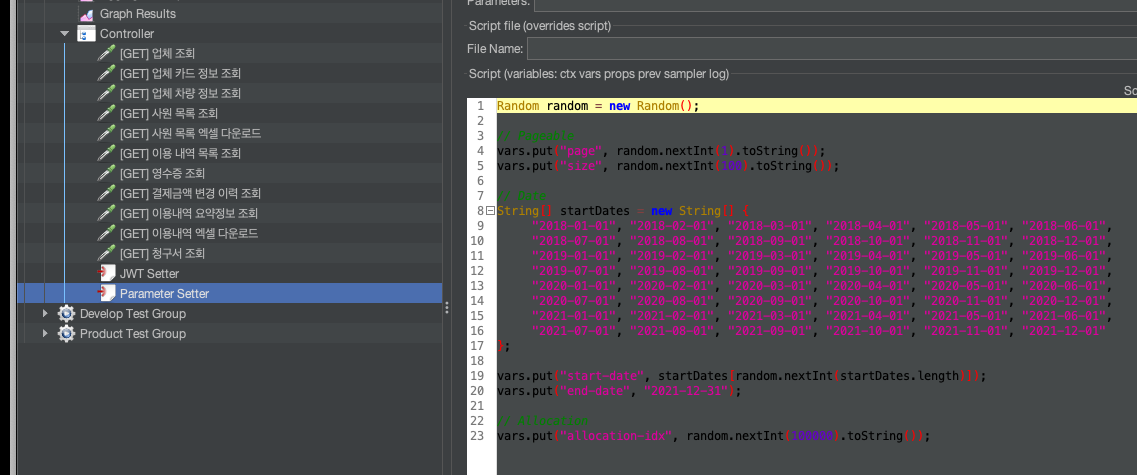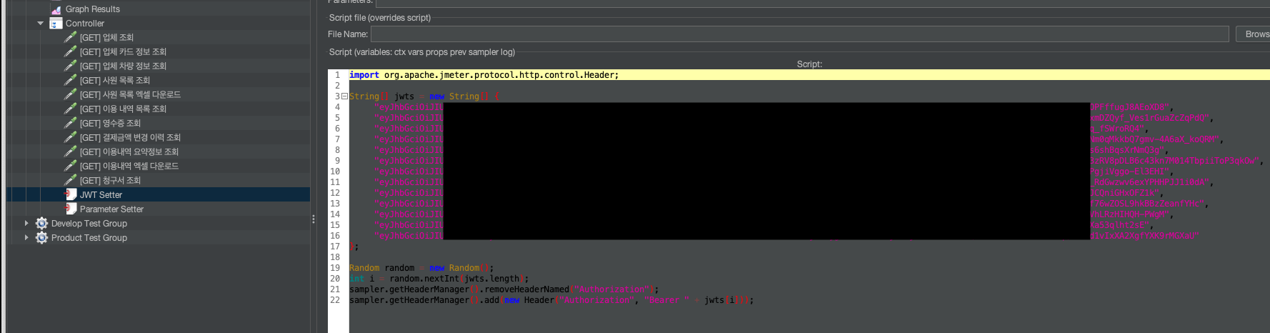 - JWT Setter: 모든 요청 전에 작동하여 Header의 Authorization 정보를 변경한다. JWT Setter에 의해 모든 요청들은 랜덤한 인증정보를 가지게 되어 요청마다 다른 결과를 받아볼 수 있게된다. (필자는 요청마다 다른 쿼리, 다른 로직, 다른 결과가 보장되어야 모든 경우의 수를 염두한 부하테스트라고 생각한다. Parameter Setter 또한 같은 이유로 작성하게 되었다.)
