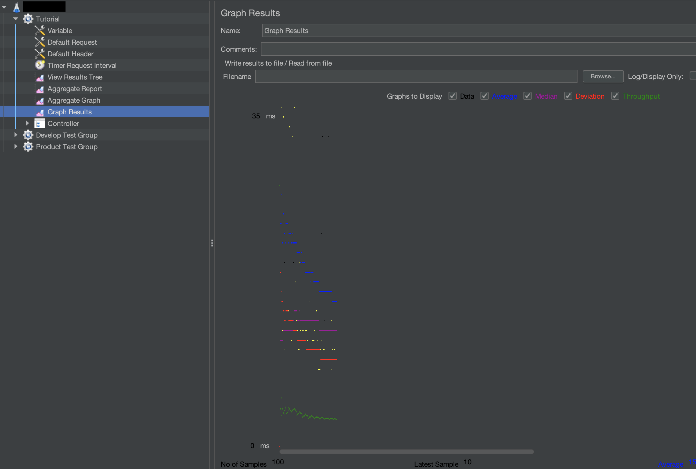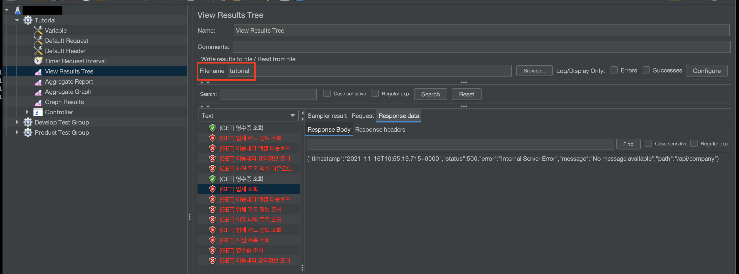 - View Result Tree: HTTP Request 요청 및 결과를 확인 할 수 있다. 보통 최초 세팅하는 상황에서 디버깅용으로 사용하게 되는듯 하다. 하지만 필자가 표시해둔 Filename: tutorial은 추후 Request 결과를 그래프로 뽑아내기 위하 저장하는 부분이므로 꼭 기억해두도록 한다.