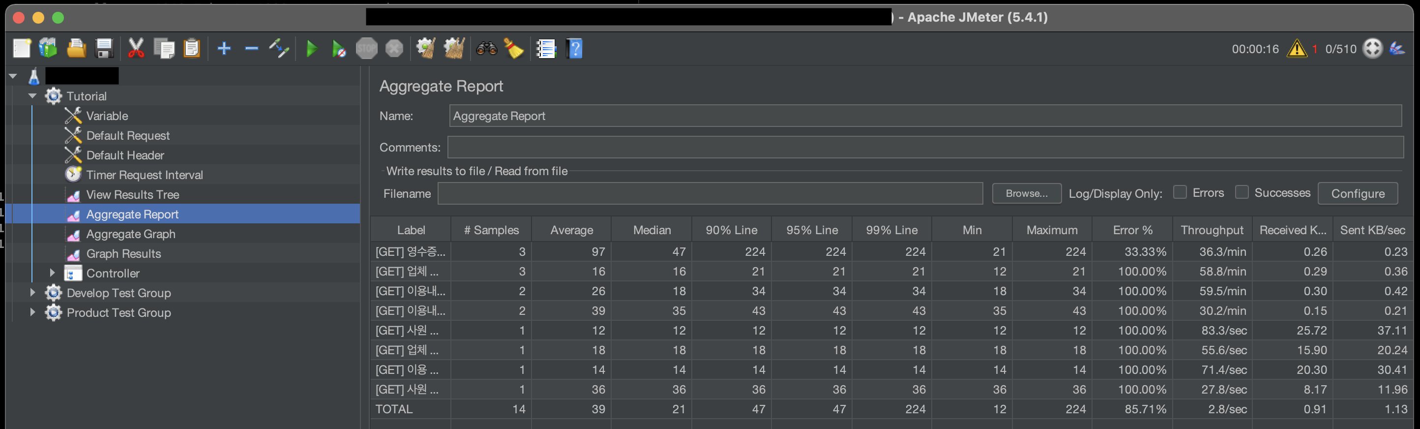 - Aggregate Report: HTTP Request의 결과를 통계 그래프로 보여준다. 각 항목별로 의미하는 것이 궁금하다면 여기(링크)를 눌러서 확인해보도록 한다.