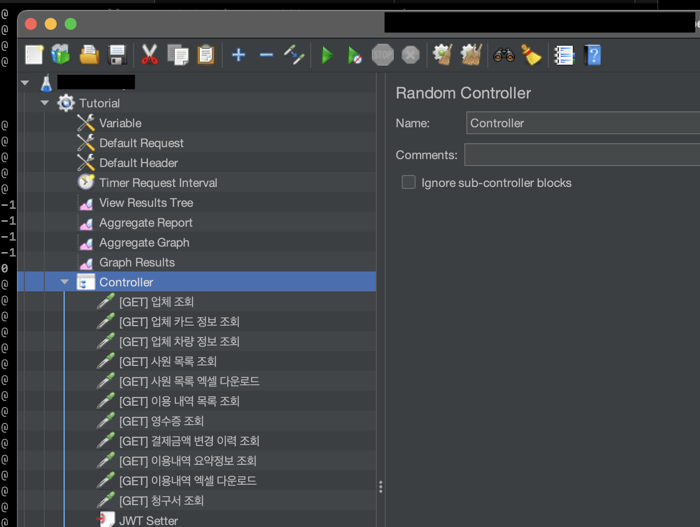 - Controller: HTTP Request들의 집단. 필자의 경우 Threads(유저)들이 무작위로 Request를 전달하도록 많은 Controller 중에서 Random Controller로 설정하였다.
