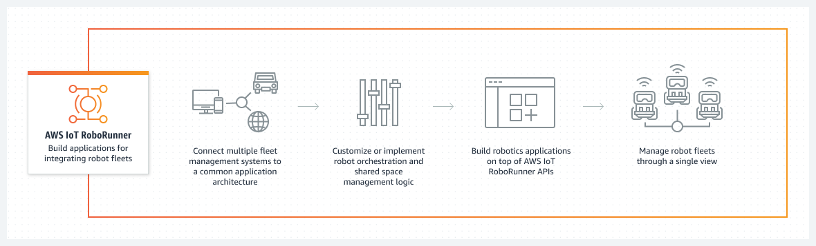 - AWS IoT RoboRunner는 여러 공급업체의 로봇 시스템을 통합하고 차량 관리 애플리케이션을 구축하기 위한 인프라를 제공한다.