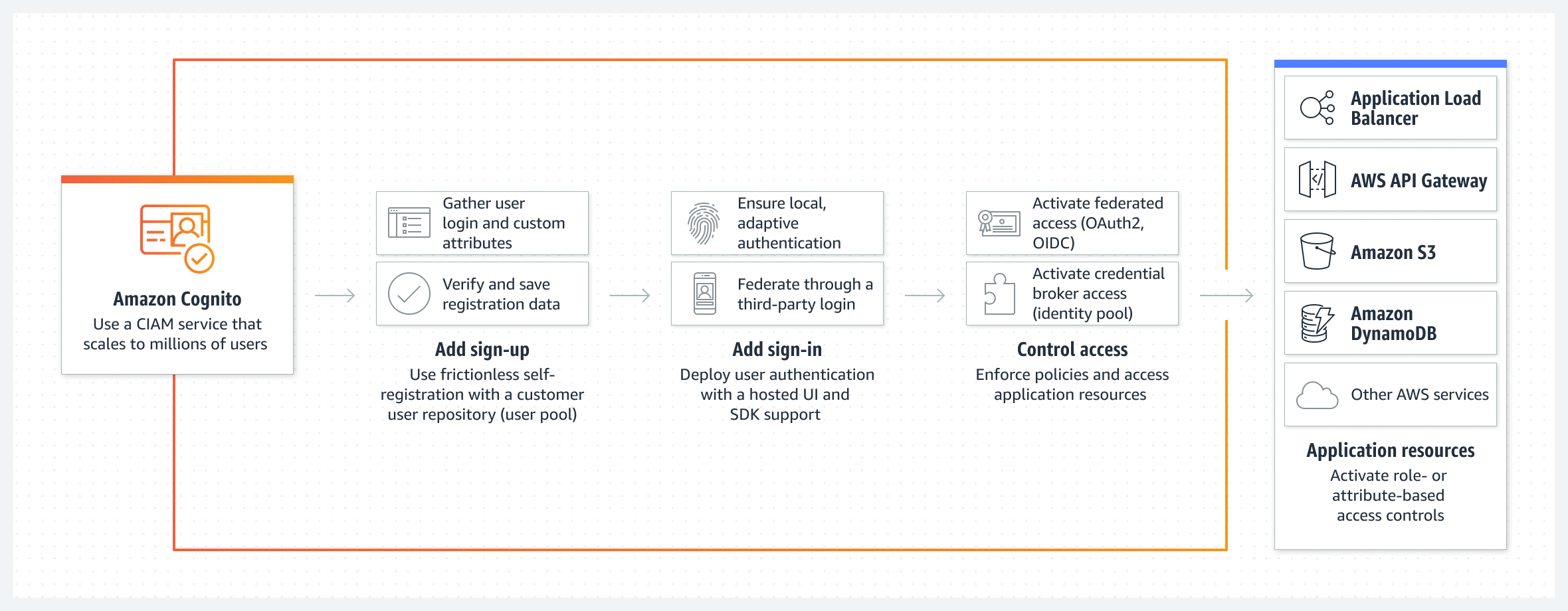 - 유연한 인증으로 고객 참여 유도: 고객이 직접 또는 소셜 또는 엔터프라이즈 ID 제공자를 통해 사용자의 브랜딩이 포함된 호스팅 UI에 로그인할 수 있다.