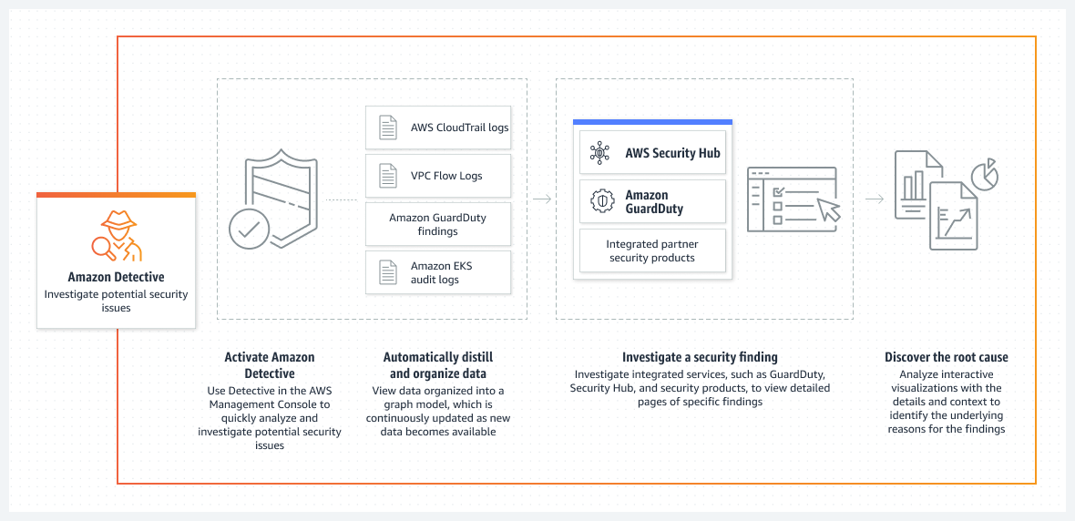 - Amazon Detective는 조사 프로세스를 간소화하고 보안 팀이 더 빠르고 효과적인 조사를 수행하도록 돕는다.