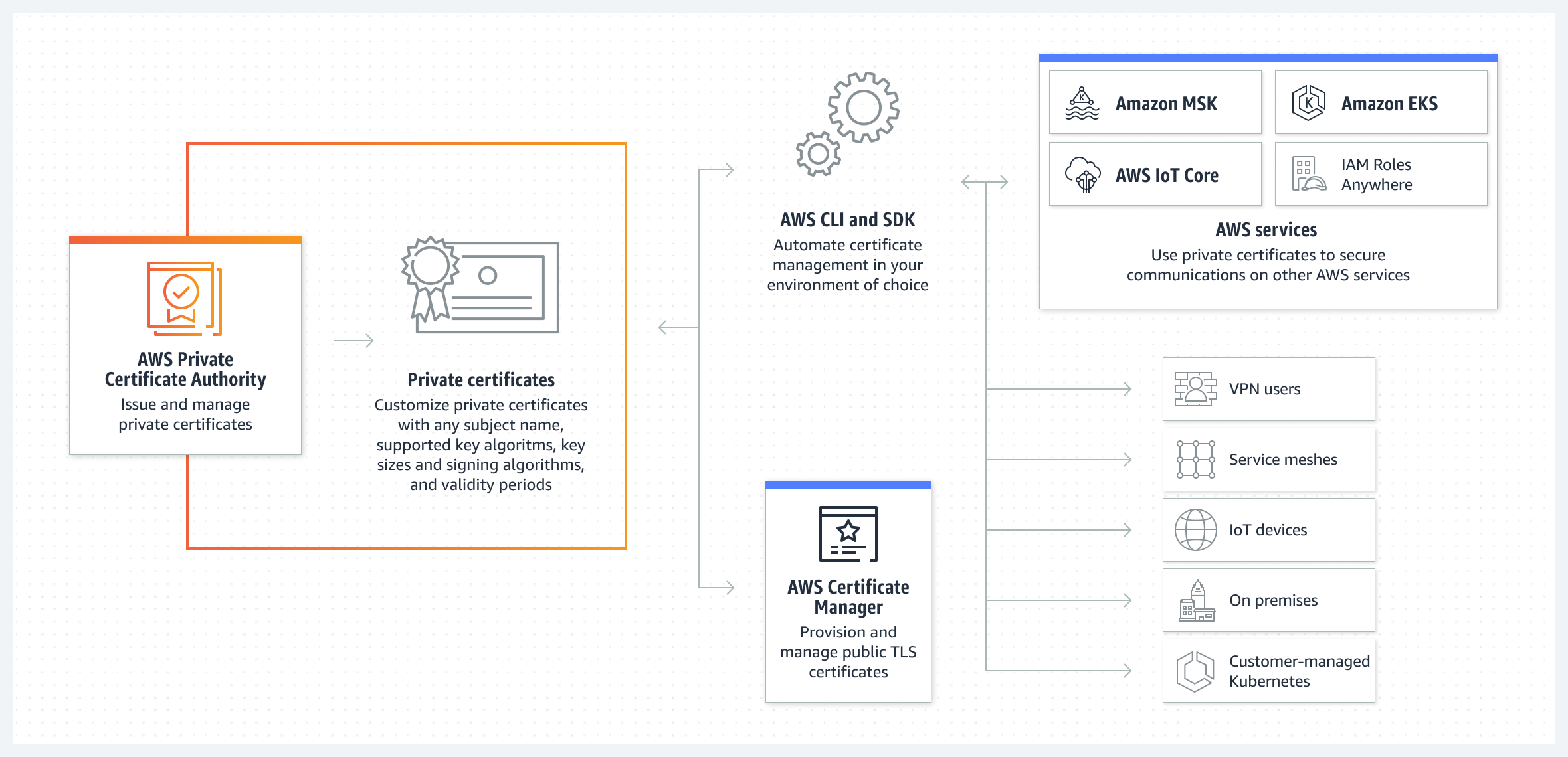 - 리소스 액세스 권한 중앙 관리: 사설 인증 기관처럼 리소스를 중앙에서 관리하여 여러 계정 간에 인증서가 발급되도록 하여 비용을 관리하고 운영 부담을 경감한다.