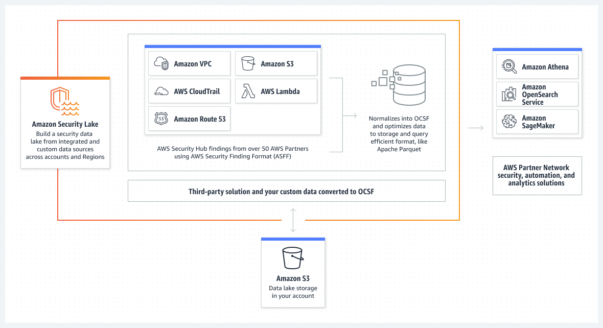 - Amazon Security Lake는 클라우드, 온프레미스 및 사용자 지정 소스의 보안 데이터를 계정에 저장된 중앙의 목적별 데이터 레이크에 자동 수집한다.