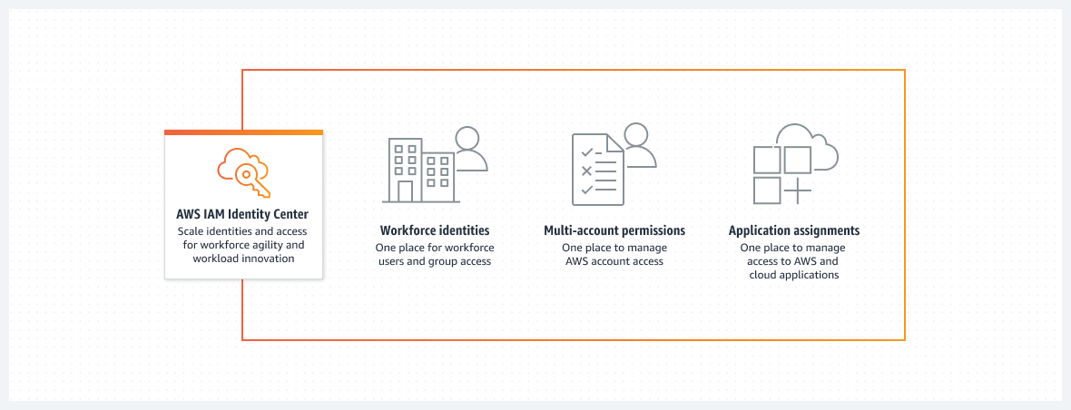 - 계정별 액세스를 관리하거나 AWS 계정 및 애플리케이션의 액세스 규모를 조정: IAM으로 계정별 아이덴티티를 관리하거나 AWS IAM Identity Center를 사용하여 AWS 전체에서 다중 계정 액세스 및 애플리케이션 할당을 제공한다.