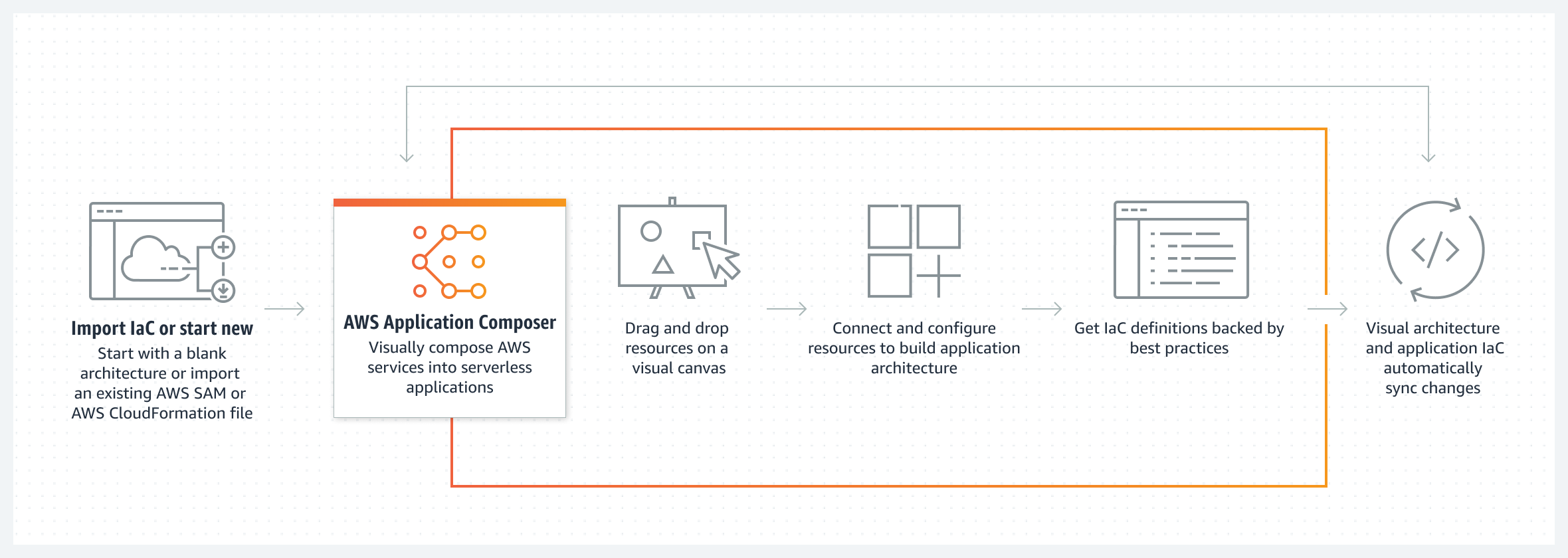 - AWS Application Composer는 서버리스 애플리케이션의 아키텍처링, 구성, 구축을 간소화하고 빠르게 진행하도록 도와준다.