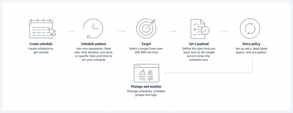 - Amazon EventBridge 스케줄러를 사용하면 단일 소스에서 수백만 개의 이벤트와 태스크를 생성, 트리거 및 관리할 수 있다.