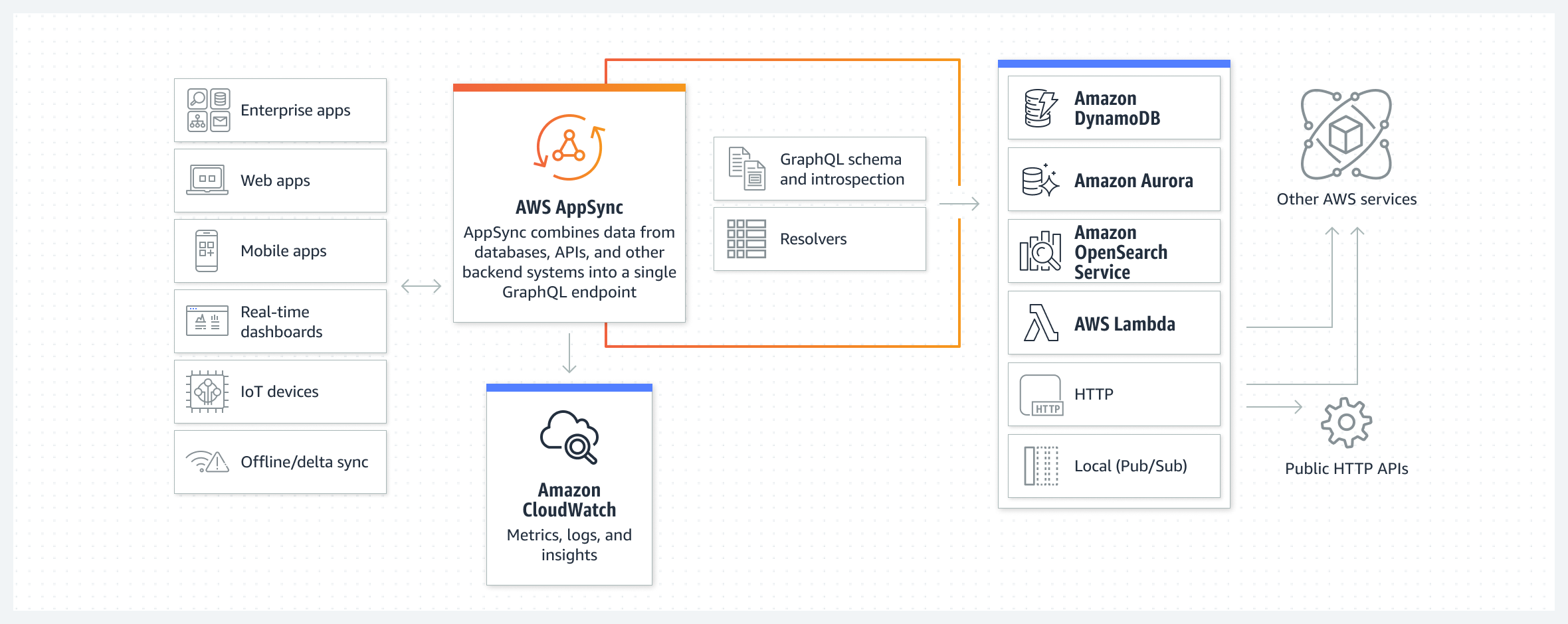 - AWS AppSync는 단일 엔드포인트를 통해 애플리케이션 개발을 간소화하는 서버리스 GraphQL 및 Pub/Sub API를 생성하여 데이터를 안전하게 쿼리, 업데이트 또는 게시한다.