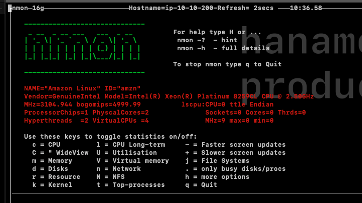 nmon의 경우 크게 실시간으로 확인하는 기능과 기록을 통해 확인하는 기능이 있다. 부하테스트 결과는 기록을 통해 확인할 예정이지만 nmon이 어떠한 프로그램인지 확인하기 위해 실시간으로 한번 확인해보도록 한다.
