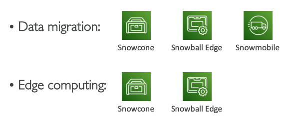 - 모든 종류의 Snow Family는 EC2 Instance & AWS Lambda 기능을 실행할 수 있다.(AWS IoT Greengrass)