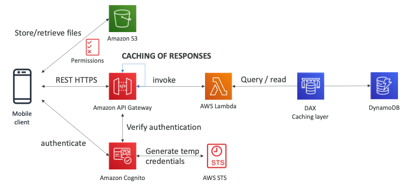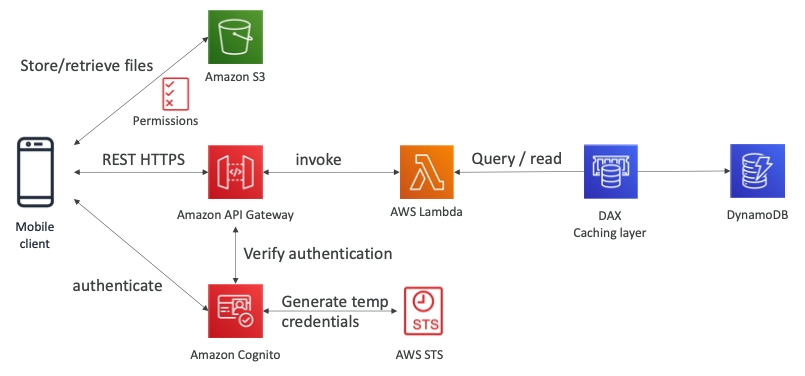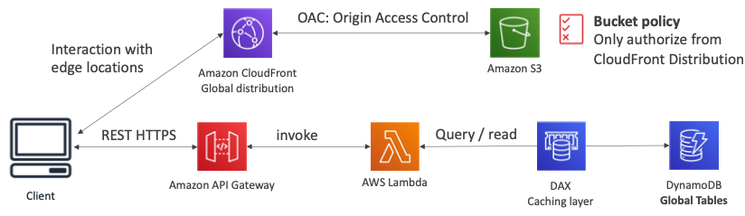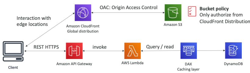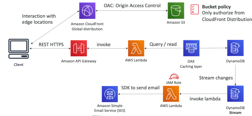 - Serverless REST API: HTTPS, API Gateway, Lambda, DynamoDB