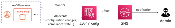 - 구성 변경 및 규정 준수 상태 알림을 "SNS"로 전송하는 기능을 사용할 수 있다. (모든 이벤트 - SNS 필터링 또는 클라이언트 사이드 필터링 사용)