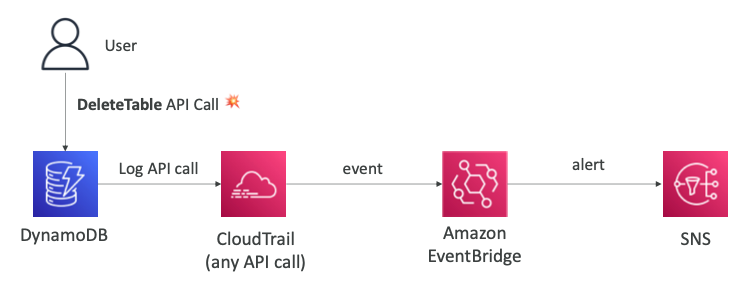 - "Amazon EventBridge"와 통합되어 "DynamoDB"의 테이블 변경 API 호출을 탐지하고 "SNS"를 통해 알림을 발생시킬 수 있다.