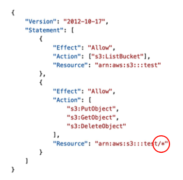 s3:GetObject,s3:PutObject,s3:DeleteObject는arn:aws:s3:::test/*에 적용된다.- => 객체 수준의 권한