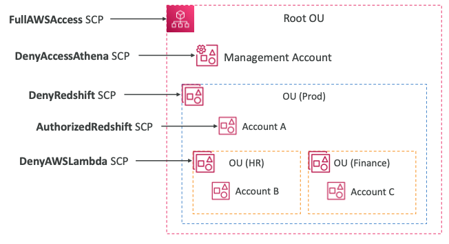 - "Prod OU"에서 명시적으로 거부했기 때문에 "Redshift"는 액세스할 수 없다.