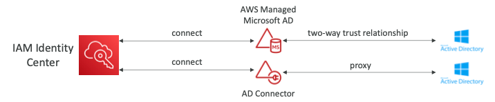 - "AWS Managed Microsoft AD"를 사용하여 양방향 신뢰 관계를 생성한다.