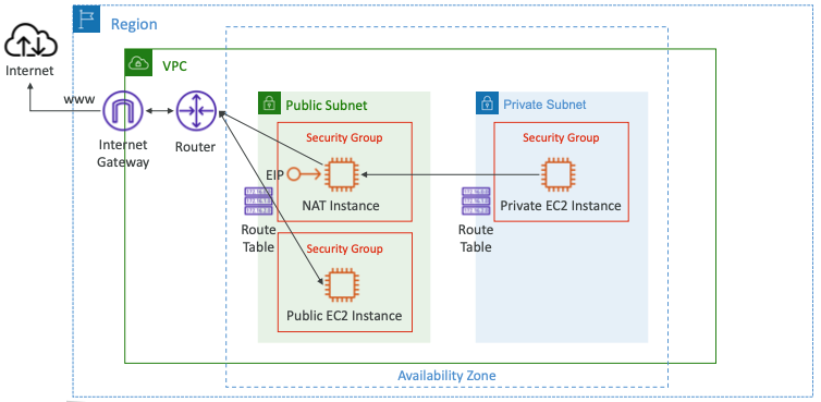 - Private 서브넷에서 NAT 인스턴스로 트래픽을 라우팅하려면 Route Table을 구성해야 한다.