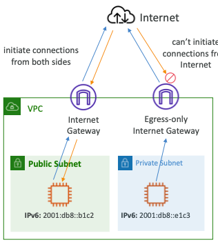 - 인터넷이 인스턴스에 IPv6 연결을 시작하지 못하도록 하면서 IPv6을 통한 VPC 아웃바운드 연결의 인스턴스를 허용한다.