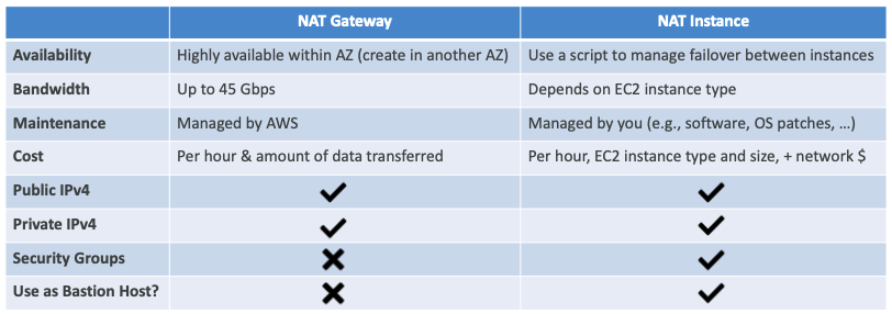 - NAT Instances: Private 서브넷의 EC2 인스턴스에 인터넷 액세스를 허용한다. Public 서브넷에 설정해야 하며, Source/Destination 확인 플래그를 비활성화한다.