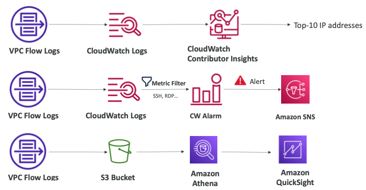 - VPC Flow Logs: VPC/서브넷/ENI 레벨에서 트래픽을 수락 및 거부할 수 있도록 설정할 수 있으며 공격을 식별하고 Athena 또는 CloudWatch Log Insight를 사용하여 분석할 수 있다.