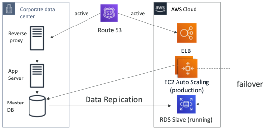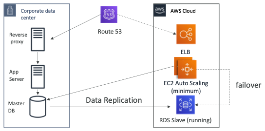 - 아래의 이미지 기준으로 회사의 데이터센터에 재해 발생하여 "AWS Cloud"에 트래픽이 몰리는 경우 EC2가 Auto Scaling되어 트래픽을 처리할 수 있다.