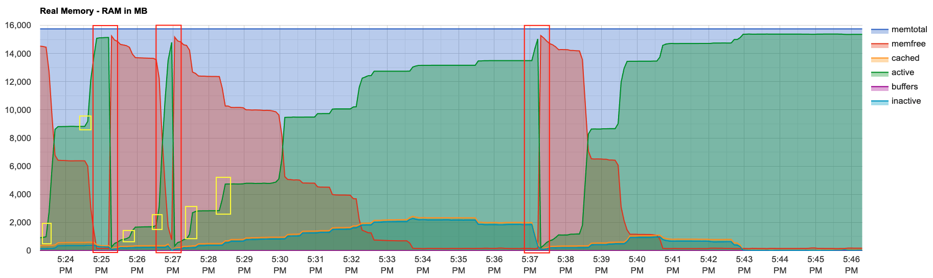 컨테이너가 재실행 되기 직전에는 항상 active memory가 memtotal에 도달직전인 것을 확인할 수 있다.