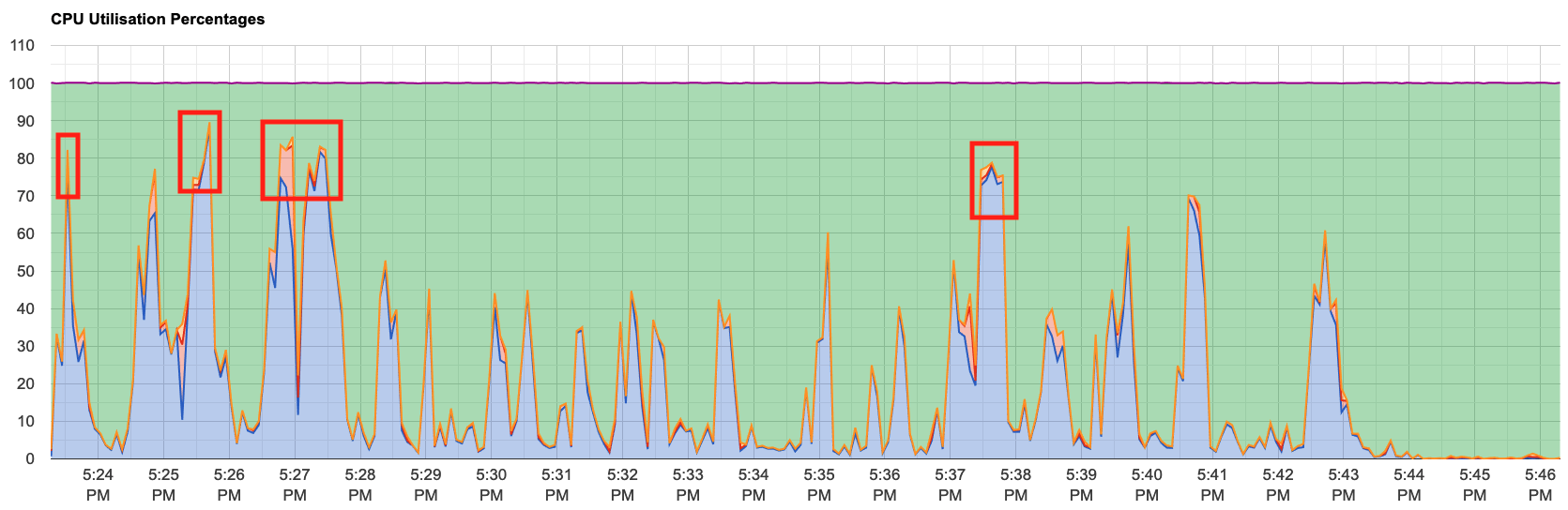 사용률이 100%를 넘기지는 않았으므로 CPU 사용량 초과로 발생한 문제는 아닐것으로 예상된다.