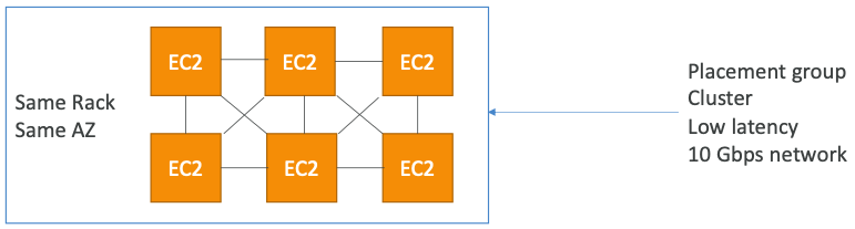 - 클러스터(Cluster): 인스턴스를 단일 가용 영역(동일한 랙)의 지연 시간이 짧은 그룹으로 클러스터링한다.