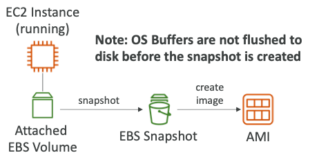 - "No-Reboot"을 활성화하면 현재 실행 중인 인스턴스는 연결된 EBS 볼륨에서 실행되는 스냅샷을 직접 얻게 된다.