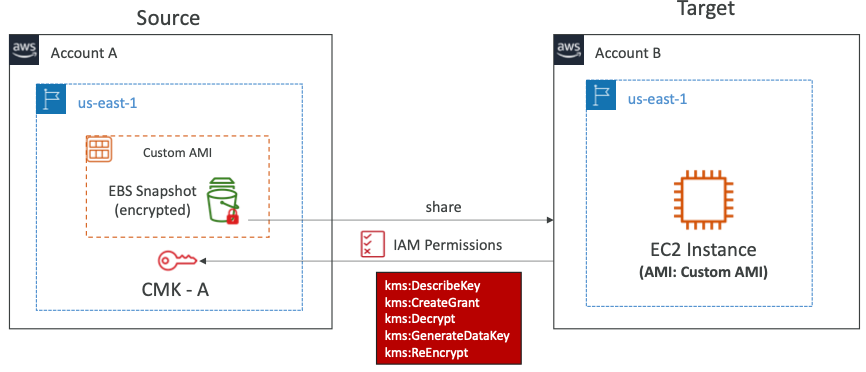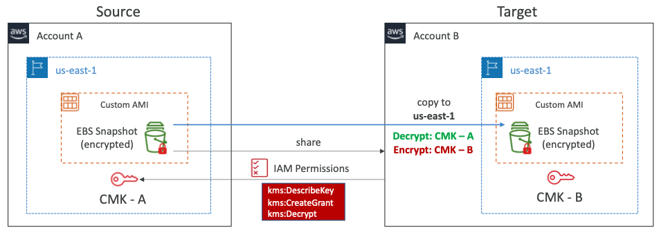 - CMK-A를 이용해 복호화하여 EBS 스냅샷을 다시 암호화하고 CMK-B와 그 고유 계정으로 다시 암호화한다.