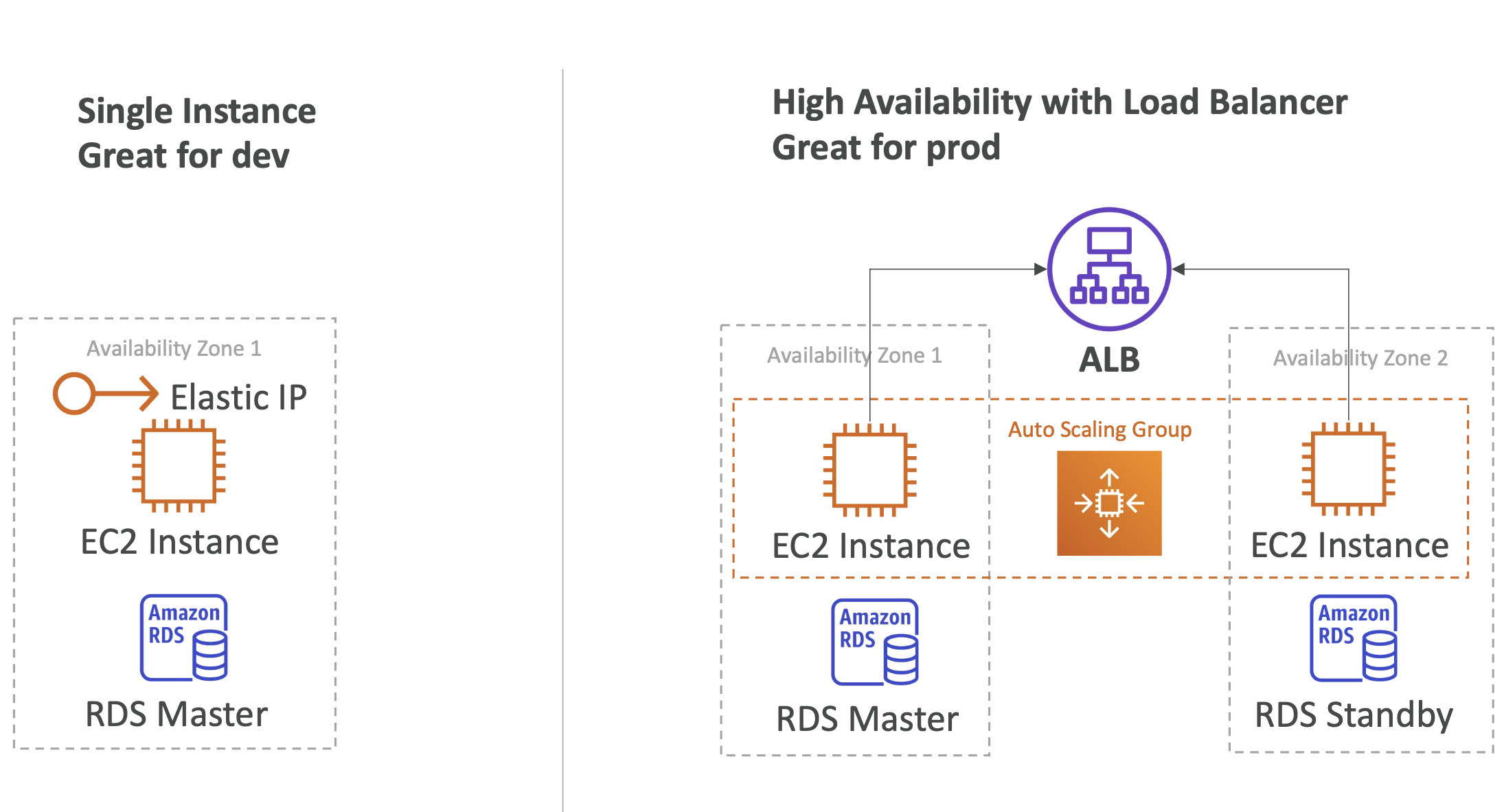 - 단일 EC2 인스턴스, 단일 RDS를 사용하여 개발 용도로 적합하다.