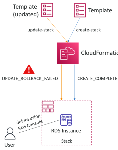 - 예를 들어, "CloudFormation" 외부에서 삭제된 이전 데이터베이스 인스턴스로 롤백하는 경우가 있다.