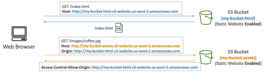 - 클라이언트가 S3 버킷에 교차 출처 요청(Cross-Origin Request)하는 경우 올바른 CORS 헤더를 활성화해야 한다.