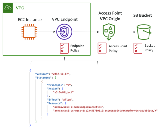 - VPC 엔드포인트 정책은 대상 버킷 및 액세스 포인트에 대한 액세스를 허용해야 한다.