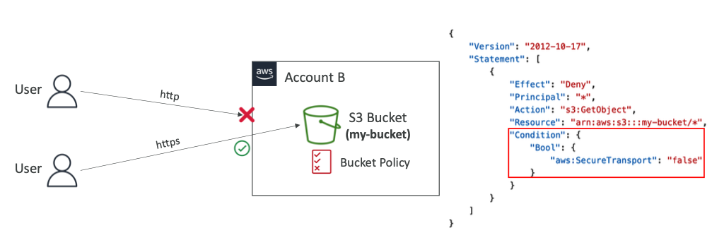 aws:SecureTransport)을 통해서 HTTPS를 사용한 객체만 업로드되도록 설정할 수 있다.