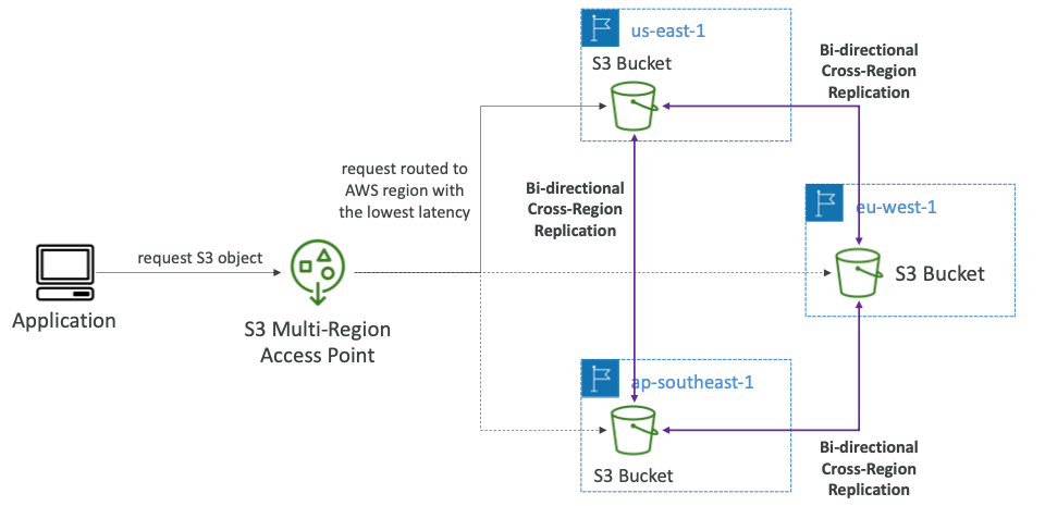- 버킷이 두 Region에 걸쳐 복제되어 있고, Multi-Region 액세스 포인트가 있다.