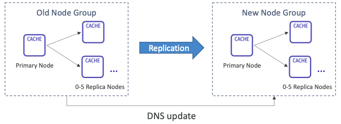 - ElastiCache는 내부적으로 새 노드 그룹을 생성한 후 데이터 복제 및 DNS 업데이트를 수행한다.