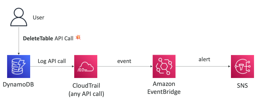 - DynamoDB의 테이블이 삭제되는 경우 CloudTrail에서 이벤트를 수집하고 EventBridge로 전달하여 SNS를 통해 알람을 받을 수 있다.