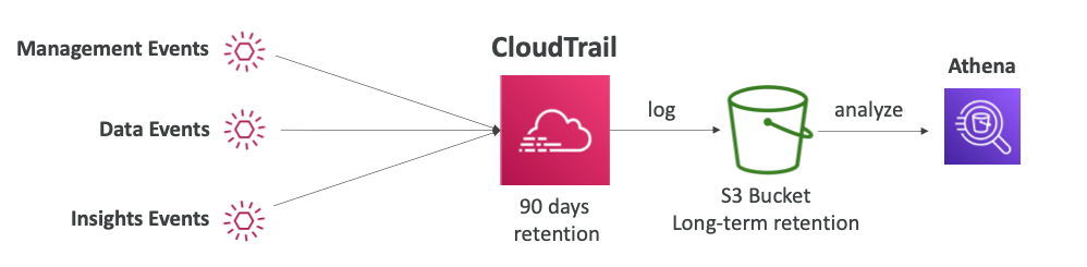 - 이 기간 이후에도 이벤트를 보관하려면 S3에 기록하고 Athena를 사용하면 된다.