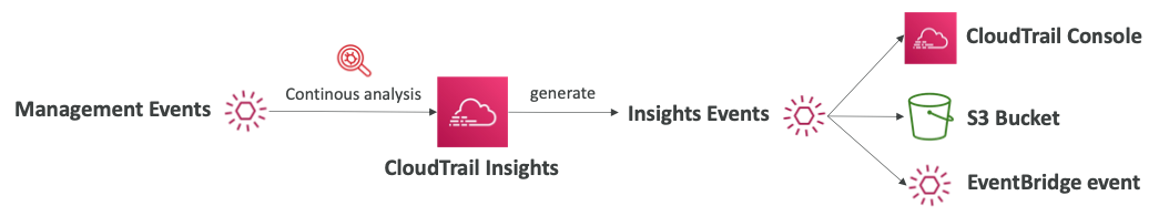 - CloudTrail Insights는 일반적인 관리 이벤트를 분석하여 기준선을 생성한다.