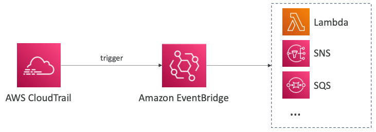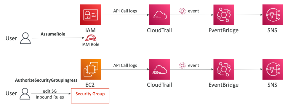 - IAM, EC2 인스턴스와 같은 서비스의 API를 호출하는 경우에도 CloudTrail은 EventBridge와 통합되어 사용자에게 알람을 전송할 수 있다.