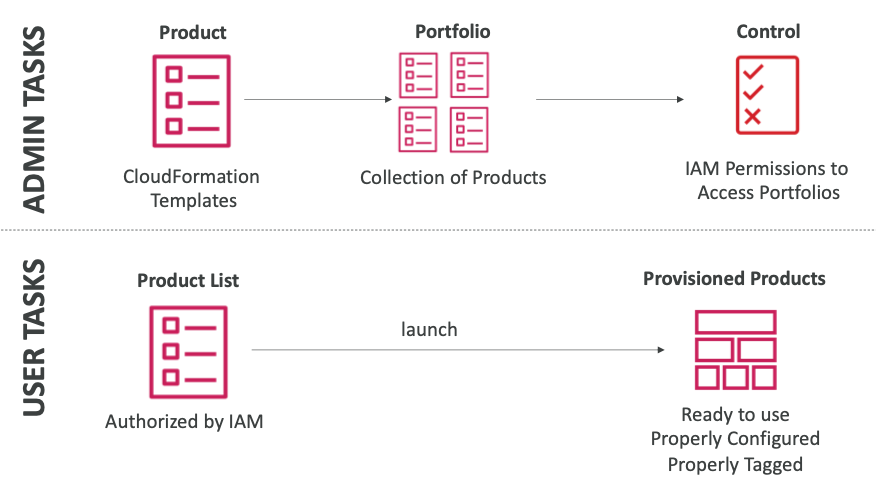 - 관리자와 사용자가 있고 관리자는 제품을 생성한다. 여기서 제품은 CloudFormation 템플릿이다.
